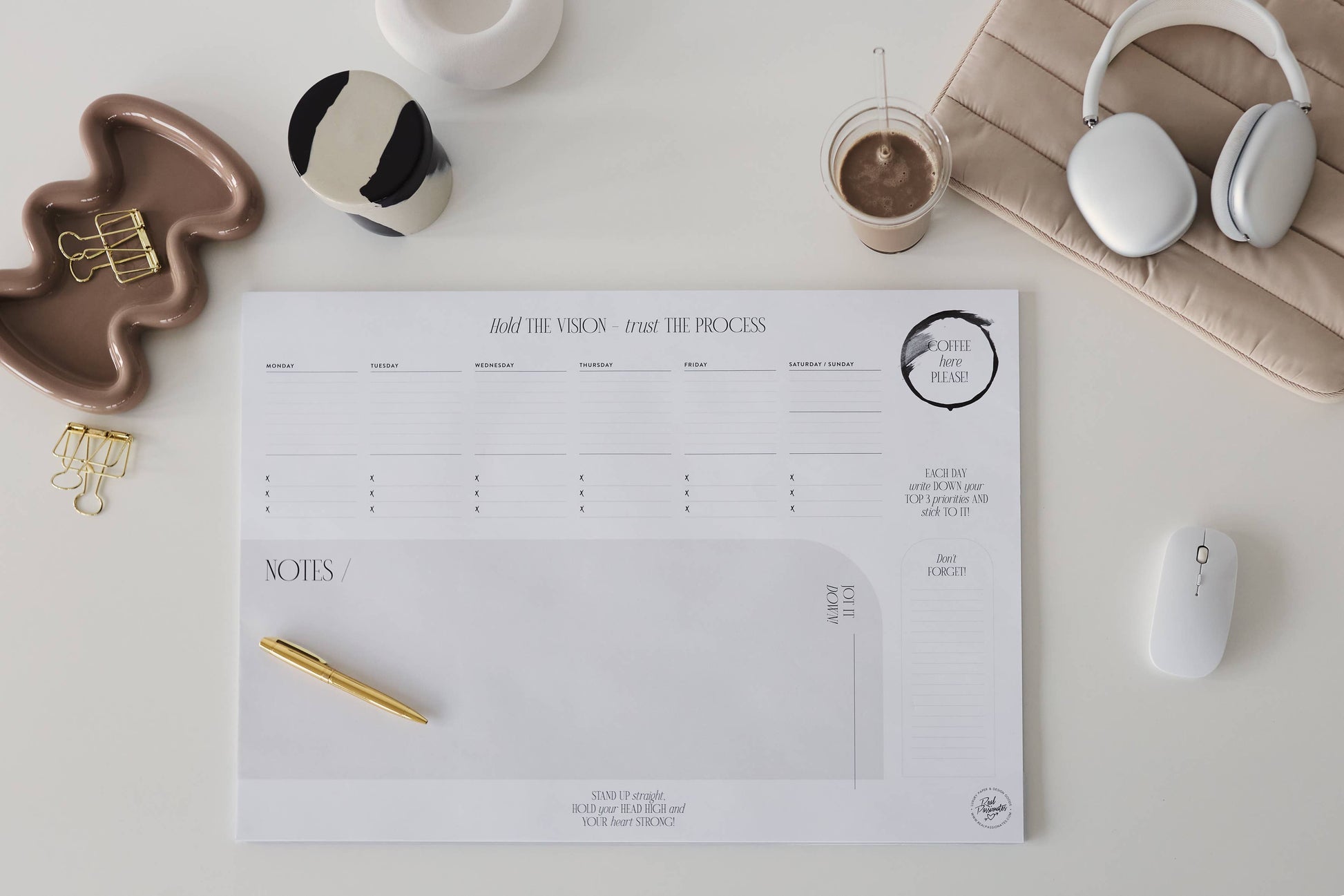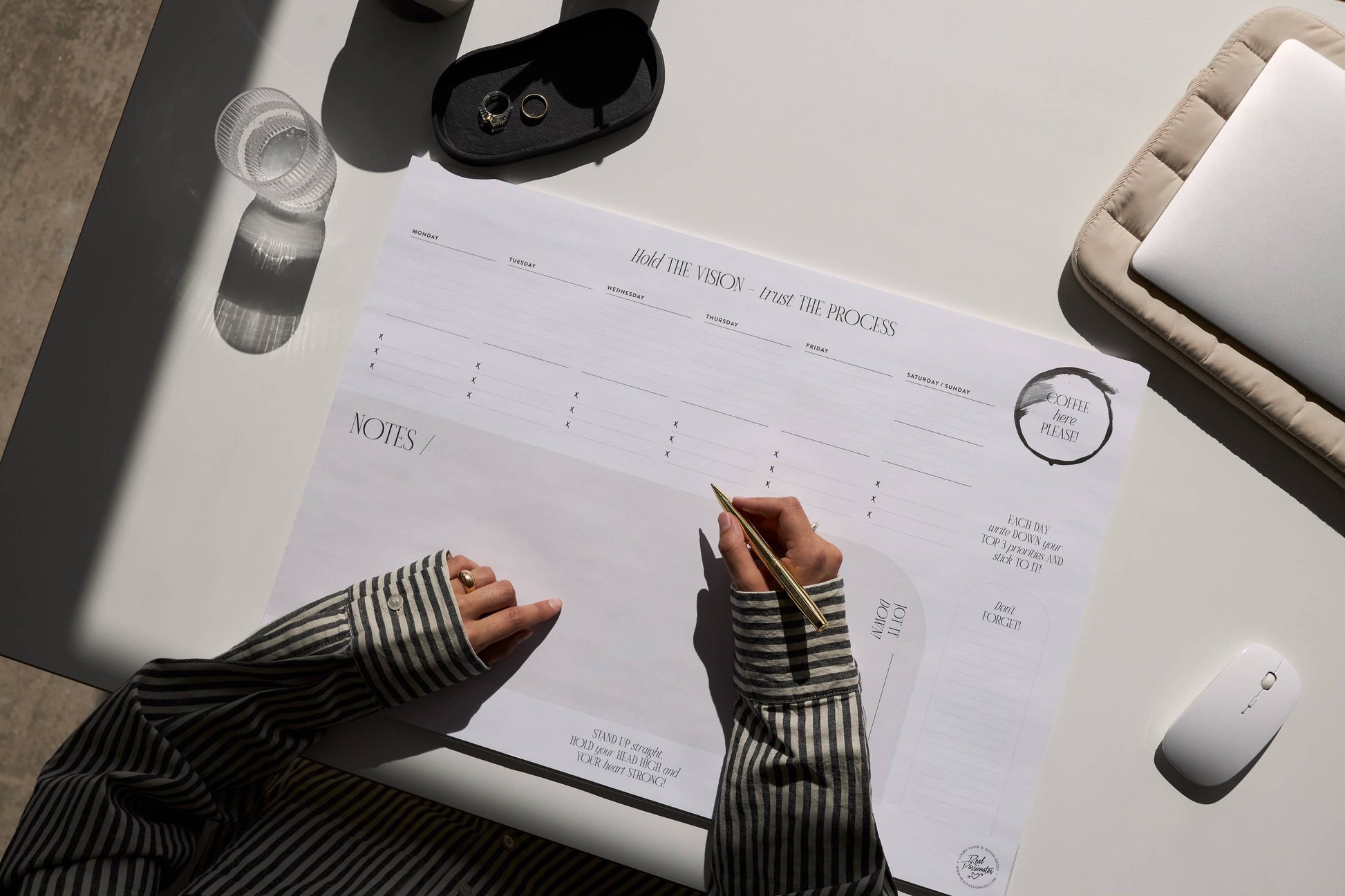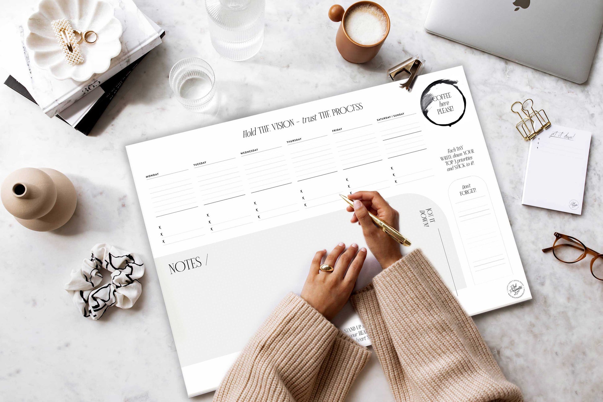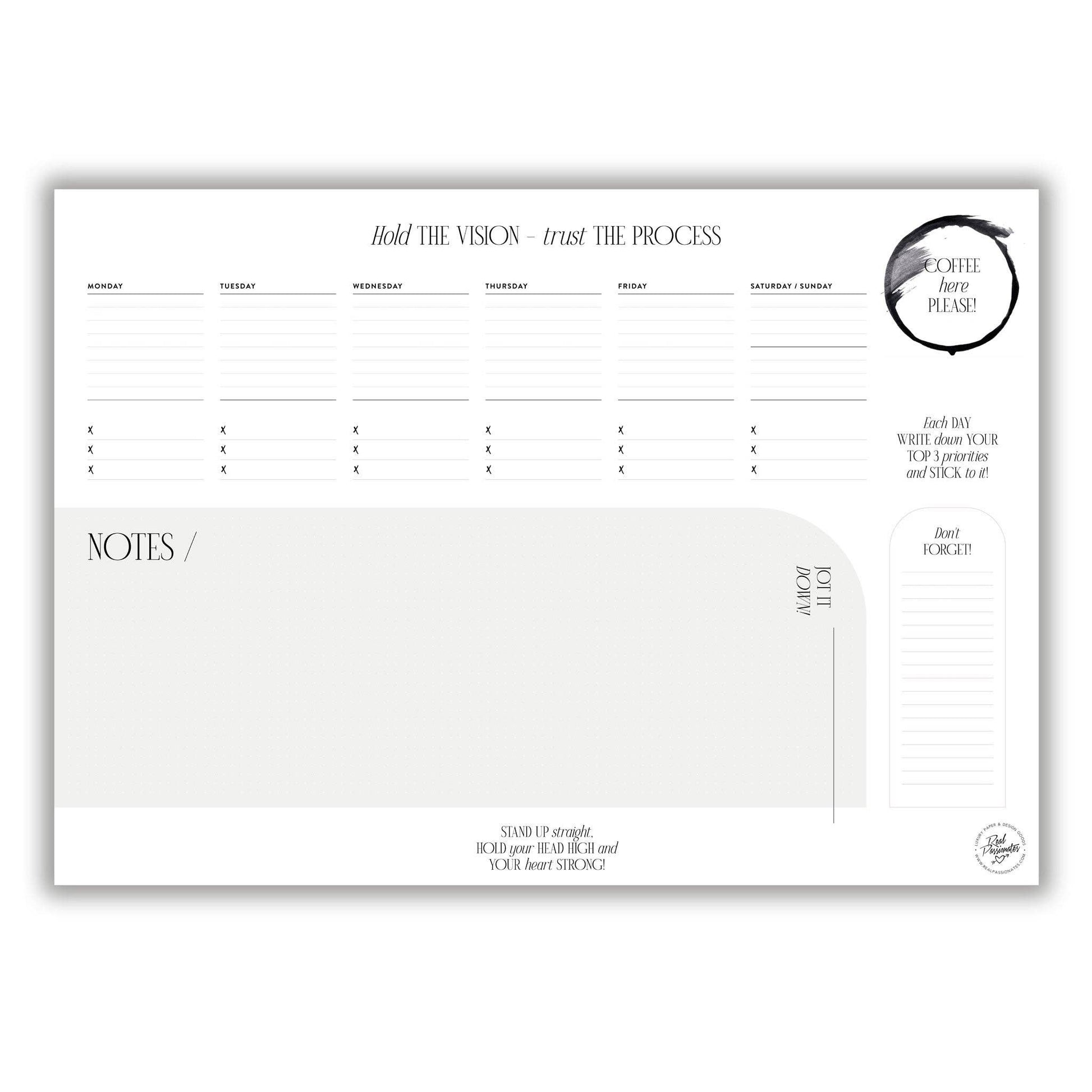 Diese Schreibtischunterlage sieht nicht nur wunderschön aus - sie ist auch ein Alleskönner. Es hat einen wöchentlichen Zeitplan mit To-Do-Listen für jeden Tag, Stundenplan, täglichen Prioritätenlisten und viel Platz für Ihre Ideen, Telefonnotizen oder Visualisierungen.